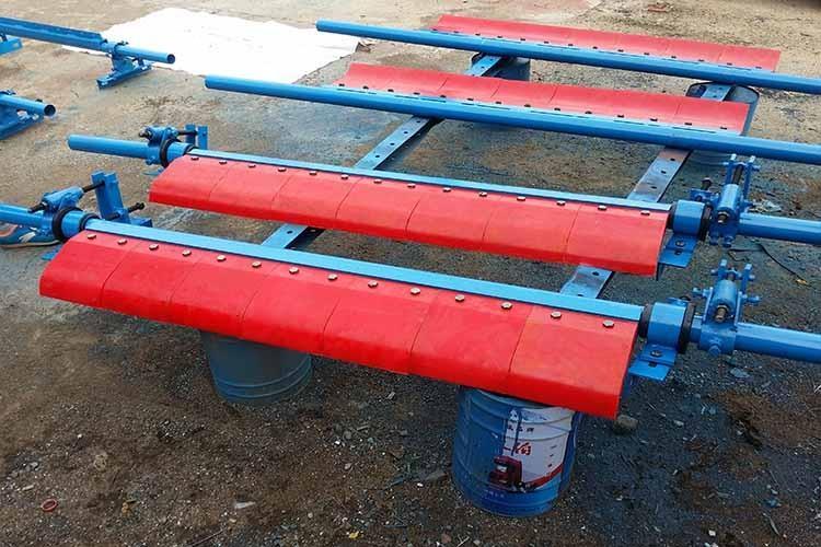 刮刀采用聚氯脂復合材料,利用模具一體加硫成形,刮刀面平整,直線度好,低摩擦、高耐磨、高強度,具有穩(wěn)定的刮料效果。可有效清除殘留皮帶上之細粒、濕粘物料。預壓式調(diào)壓器確保刮刀與皮帶的穩(wěn)定接觸壓力。刮刀面由多塊窄幅聚氨脂刮板組成,具有空形緩沖孔,對各種皮帶都有良好跟隨性。